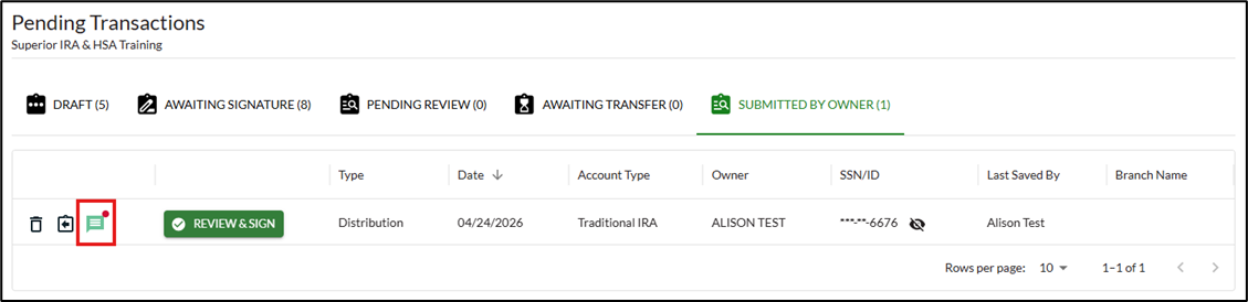 Upon completion, Transactions Administrators can view the account owner’s comments by clicking the Comments icon in the Submitted by Owner queue on the Dashboard.
