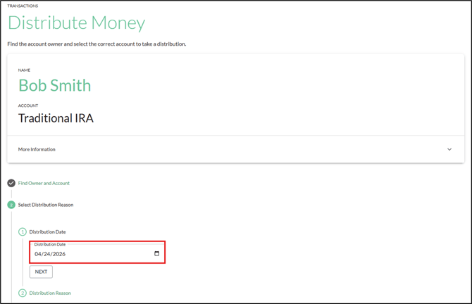 - Transactions – In the Distribute Money workflow, the Distribution Date section has moved up to appear at the beginning of the Select Distribution Reason section. This change was made to more accurately track the reason codes to display if an account owner is over or under age 59.5.