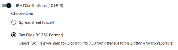 - Tax File (IRS 750 Format): Your organization will upload an IRS 750 formatted file to the Superior platform for the 1099 and/or 5498 series reporting and review/correct any mismatching values that may occur from that file upload.